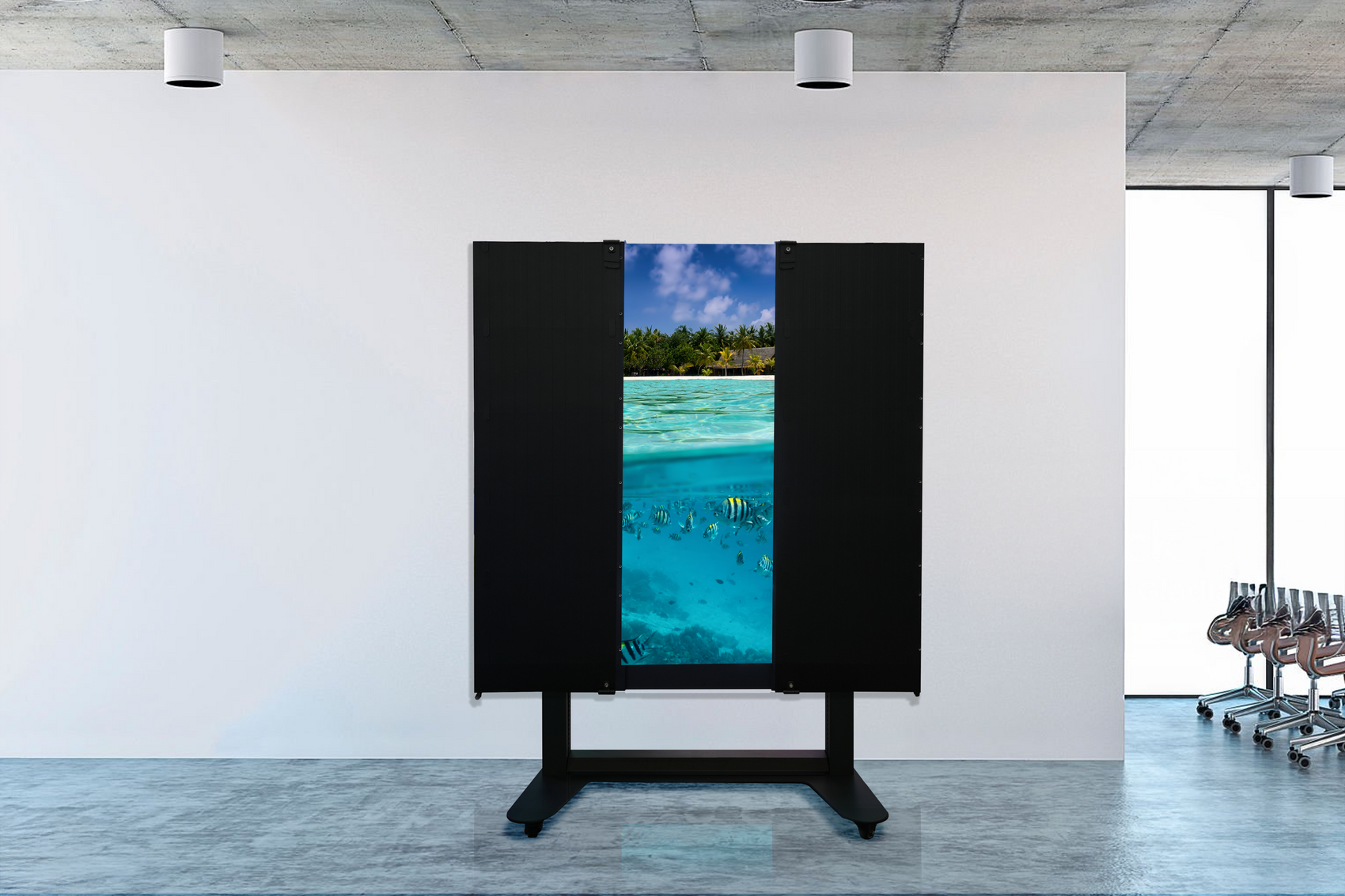 Big screen energy, jetset portability. The AIO glides through lifts and corridors in its compact form, then expands automatically on-site to reveal a massive 2400 x 1350 resolution canvas at a bold 135” diagonal. With HDMI and DVI inputs, it’s ready for BYOD workflows - just plug in and present. Perfect for training rooms, command centres, multi-use spaces, and anywhere that needs high-impact visuals without permanent fixtures.