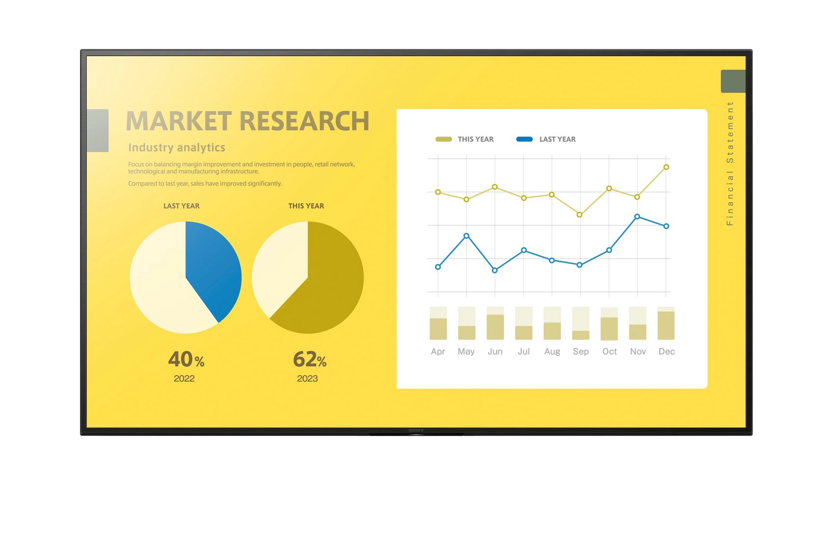 Sony displays deliver 4K visuals, vibrant colours and wide viewing angles, so everyone in the room gets a clear view. Perfect for sharing presentations, video content, live data, or in any professional setting where first impressions matter.