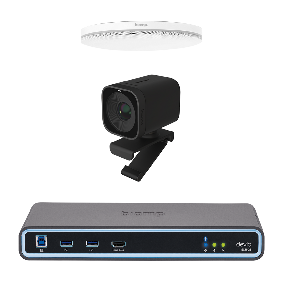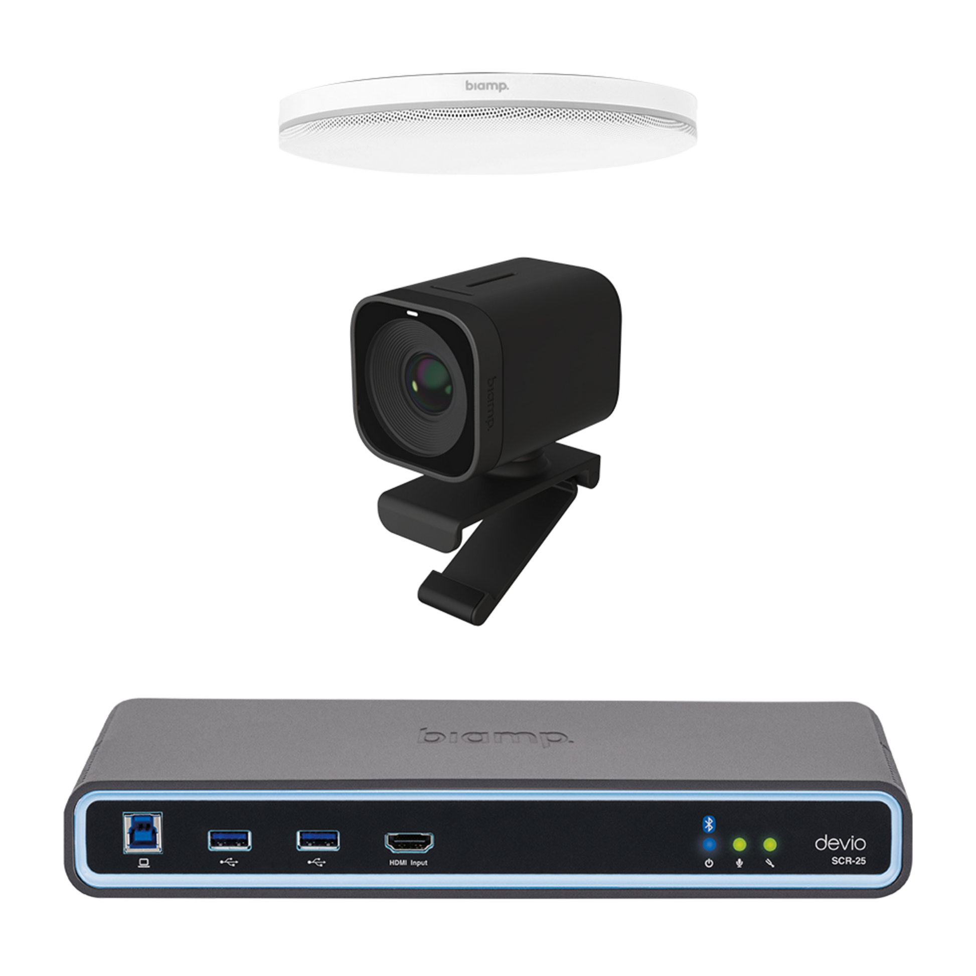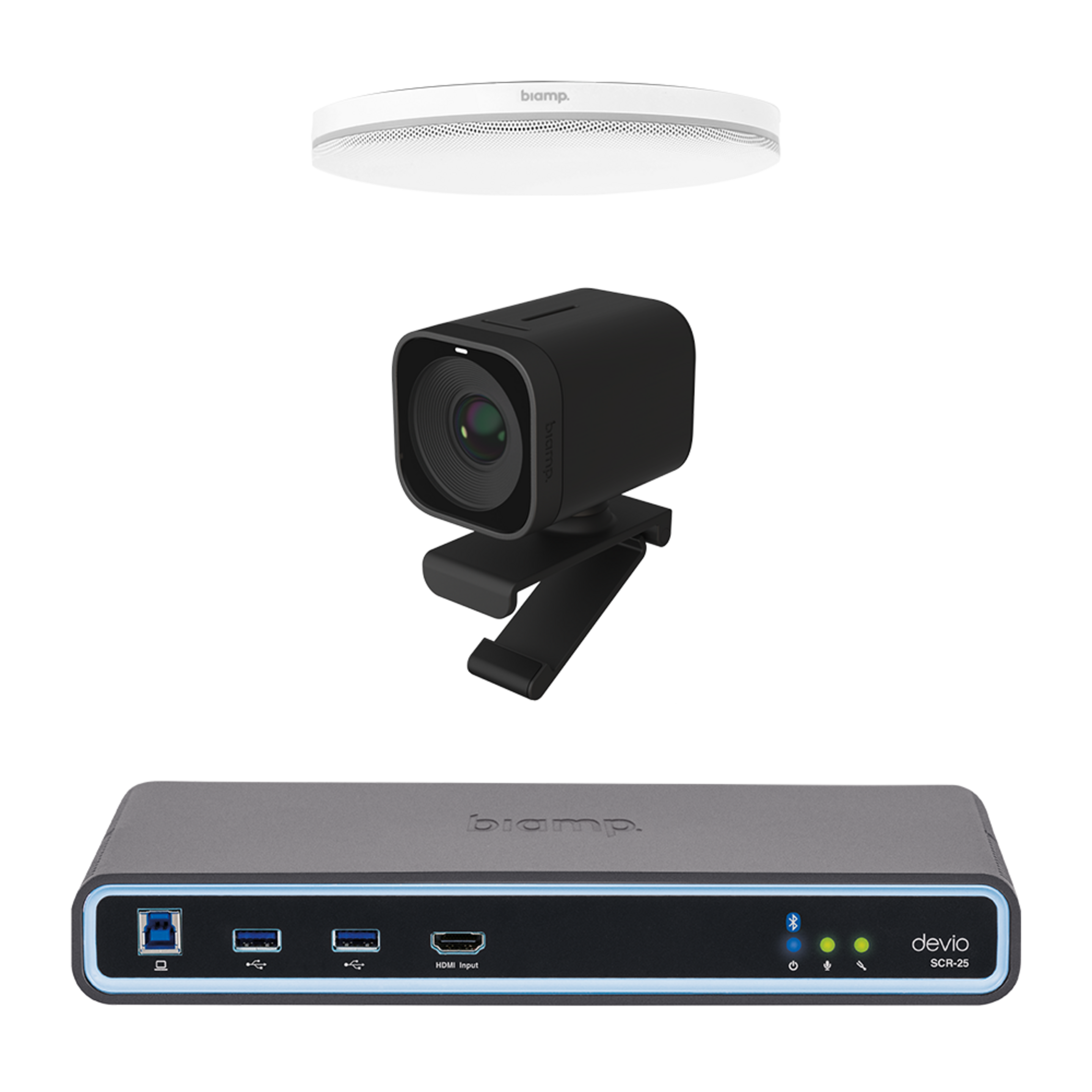 The Biamp MRB-S-SCR25-CX is a complete video conferencing bundle designed to deliver high-quality audiovisual performance in huddle rooms and small conference spaces. This bundle supports a Bring Your Own Device (BYOD) approach, allowing seamless integration with industry-leading conferencing platforms such as Microsoft Teams, Zoom, BlueJeans, and Google Meet.