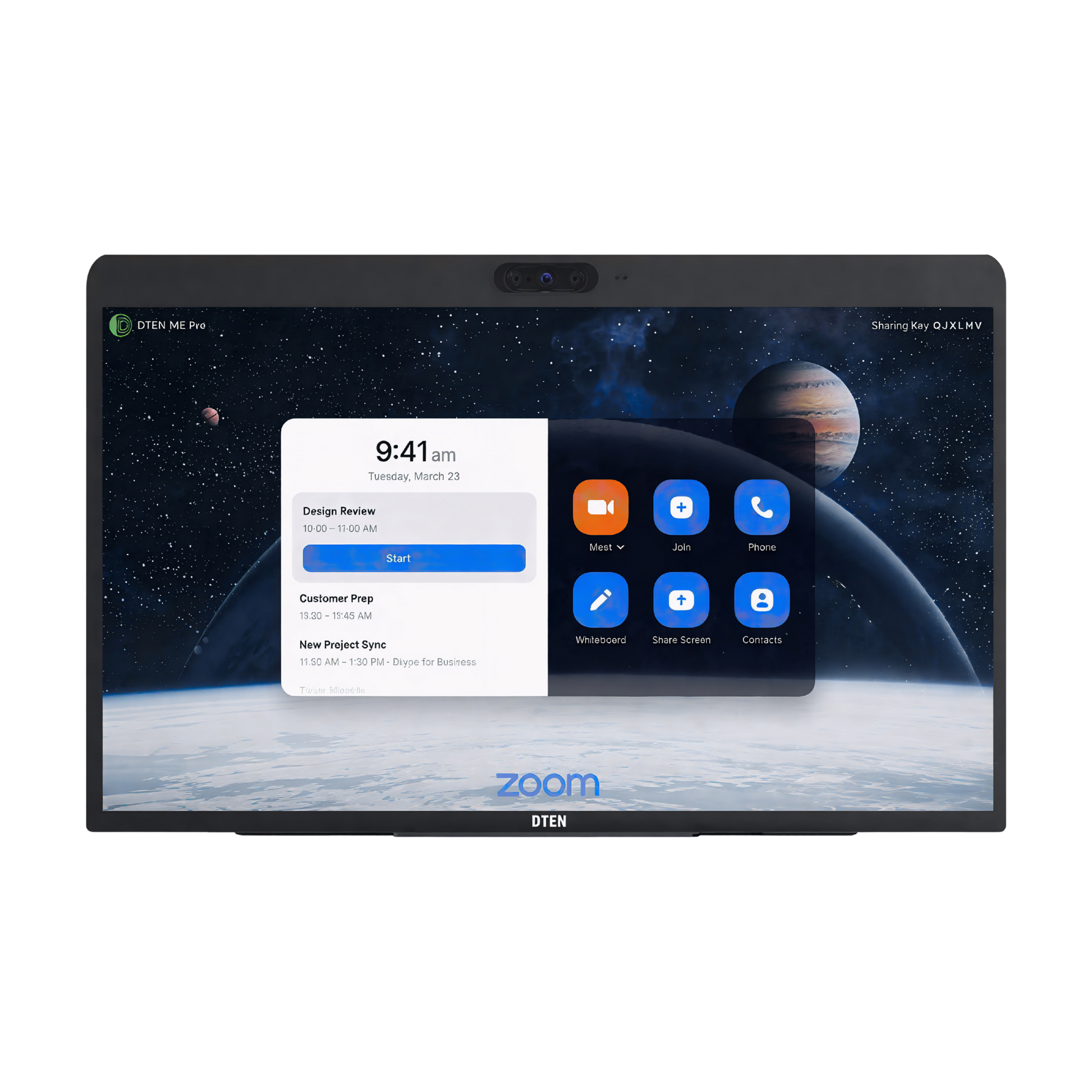 - Triple-camera system: Combined HFoV up to 160° (main camera 90°) with PTZ/presets, Zoom Rooms Auto Framing & Smart Gallery, plus DTEN Smart Framing for equitable views.