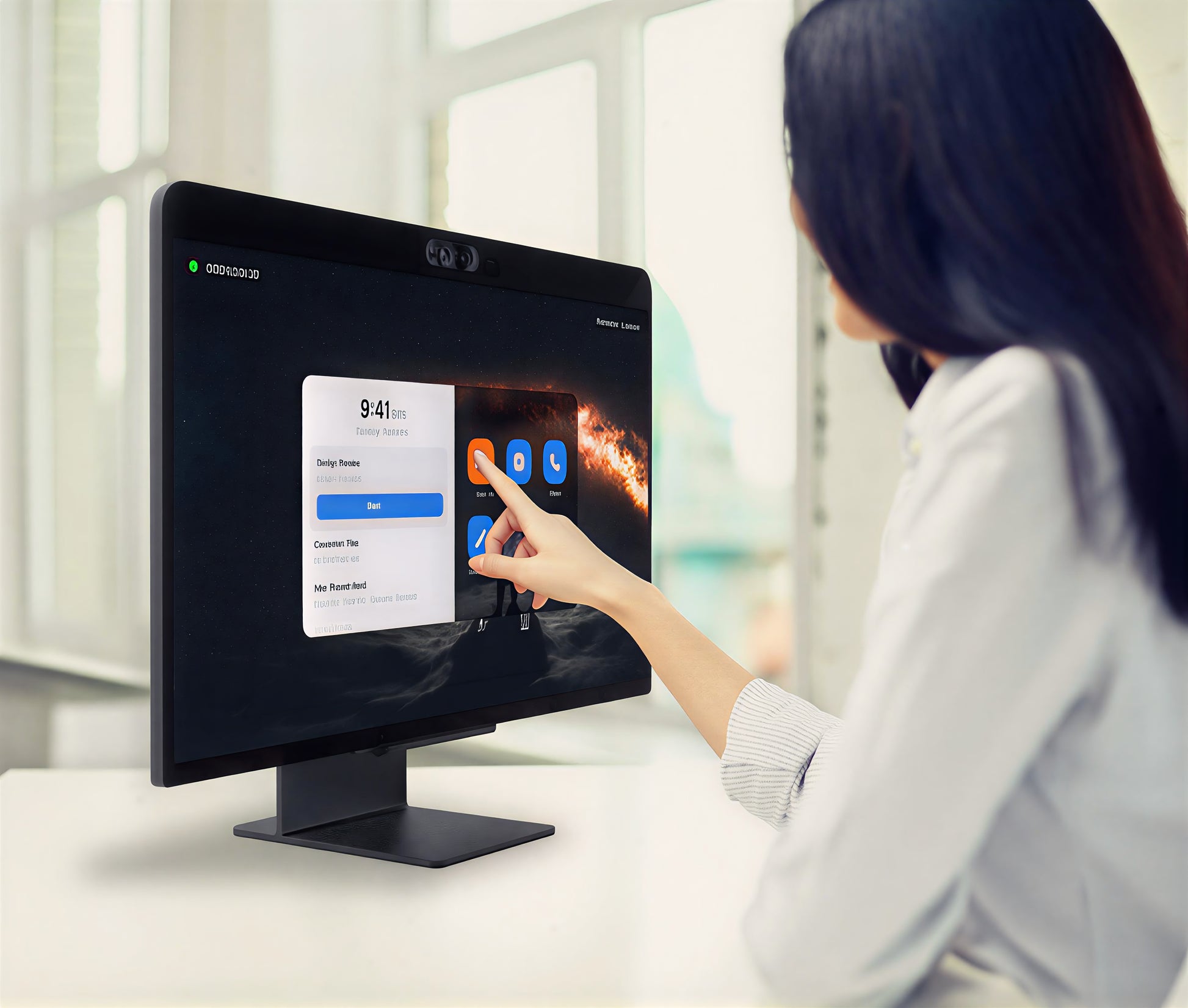 - 27" touch collaboration: Full-HD (1080p) LED display with 10 touch-points and AI-assisted touch accuracy for whiteboarding, annotation and navigation.