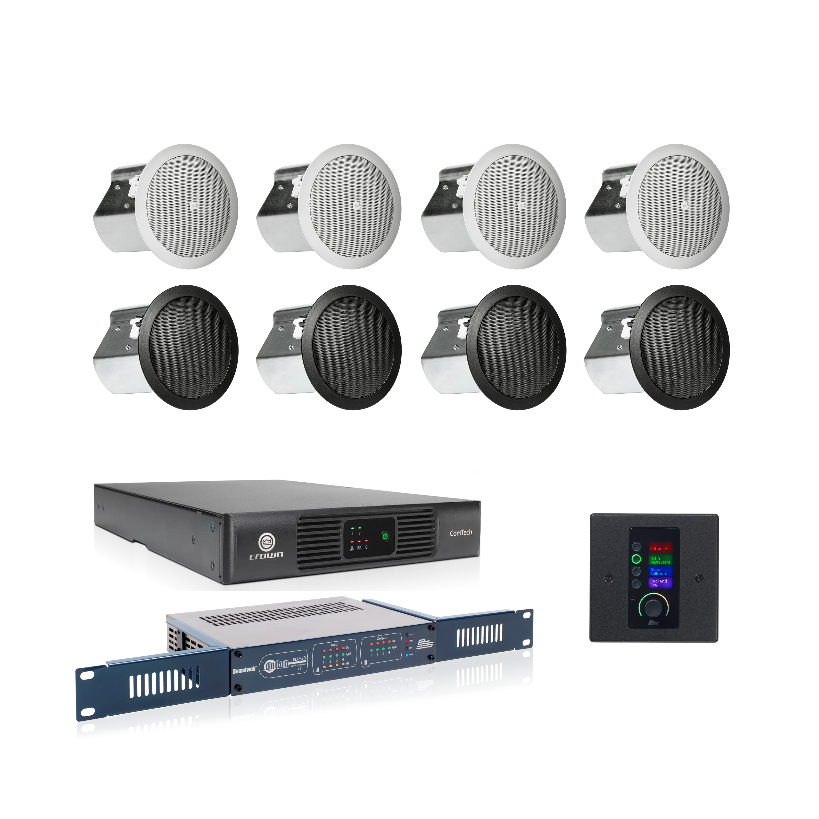 - Perfect for Café Environments: Designed to deliver smooth and reliable audio throughout the day across seating, ordering, and lounge areas with the Crown CTD-2125 Amplifier and BSS BLU-50v2 DSP.