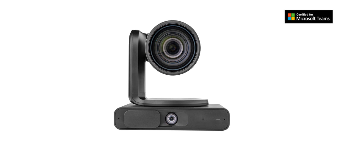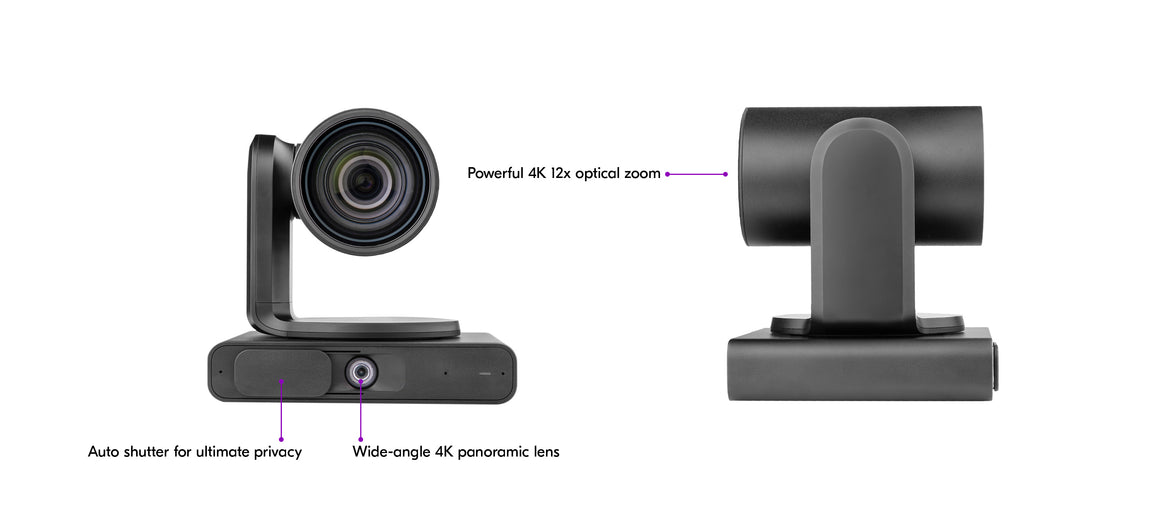 • Dual-Lens Design: Combines a 12x optical zoom PTZ lens with a 119° panoramic wide-angle lens for complete room coverage.