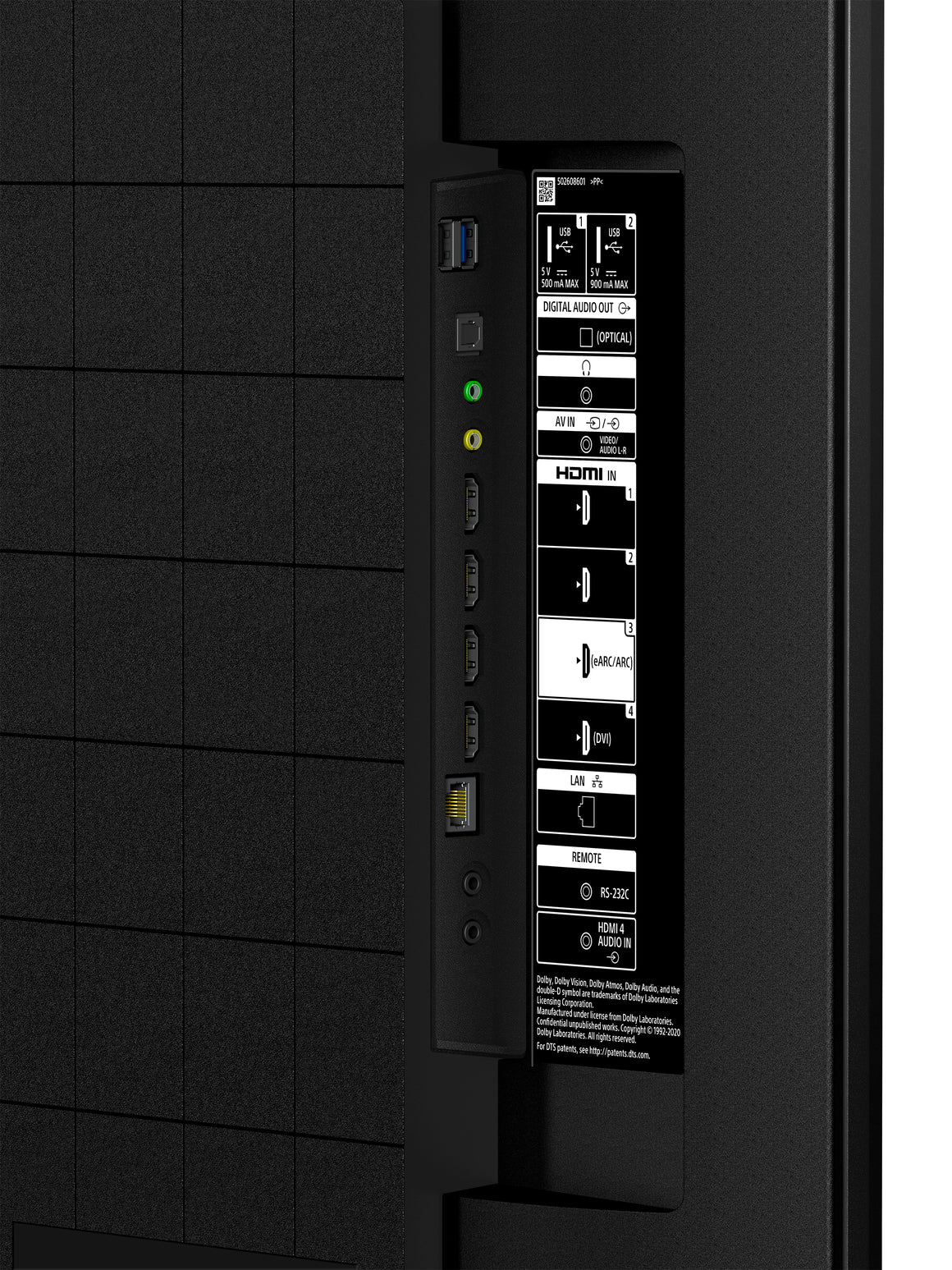Connectivity | HDMI Inputs: 4 (Side) USB Ports: 2 (Side) Ethernet Input: 1 (Side) RS-232C Control: Yes Wireless LAN: Integrated Apple AirPlay / Chromecast Built-In: Yes |