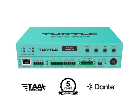 The 30W PoE+ Dante Power Amp (TAV-DPA30P) is a compact, plenum-rated amplifier and Dante® audio bridge built for commercial AV, education, and government applications. It delivers 2x15W stereo or 1x30W mono audio and features analog/Dante conversion, Hi-Z/Lo-Z support, integrated DSP, and triple power redundancy—all within a rugged Turtle Aqua chassis.