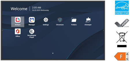 | Inputs | HDMI × 3 (HDMI 2.1 4K@60Hz; HDMI 3 with ARC), USB-A × 2, USB-C × 1 (DP 1.2, 15W PD, Ethernet sharing, Smart USB), RS232 × 1, Wi-Fi slot × 1 |